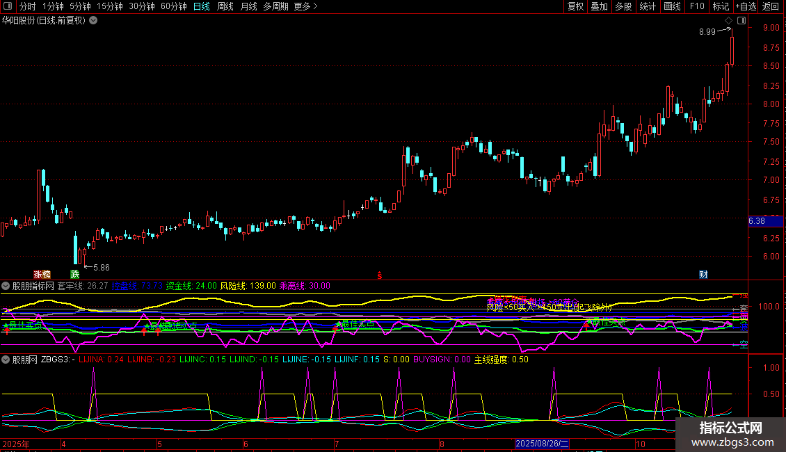 主图指标是均线参考 + 资金流筛选 + 强势突破共振的主图工具,整合中期 / 长期趋势、主力资金动向、短期爆发力三重逻辑,在满足 “低风险资金安全垫 + 强趋势突破” 时,以黄色信号标注买点,适用于通达信软件,核心用于波段操作(持股 3-8 个交易日)。