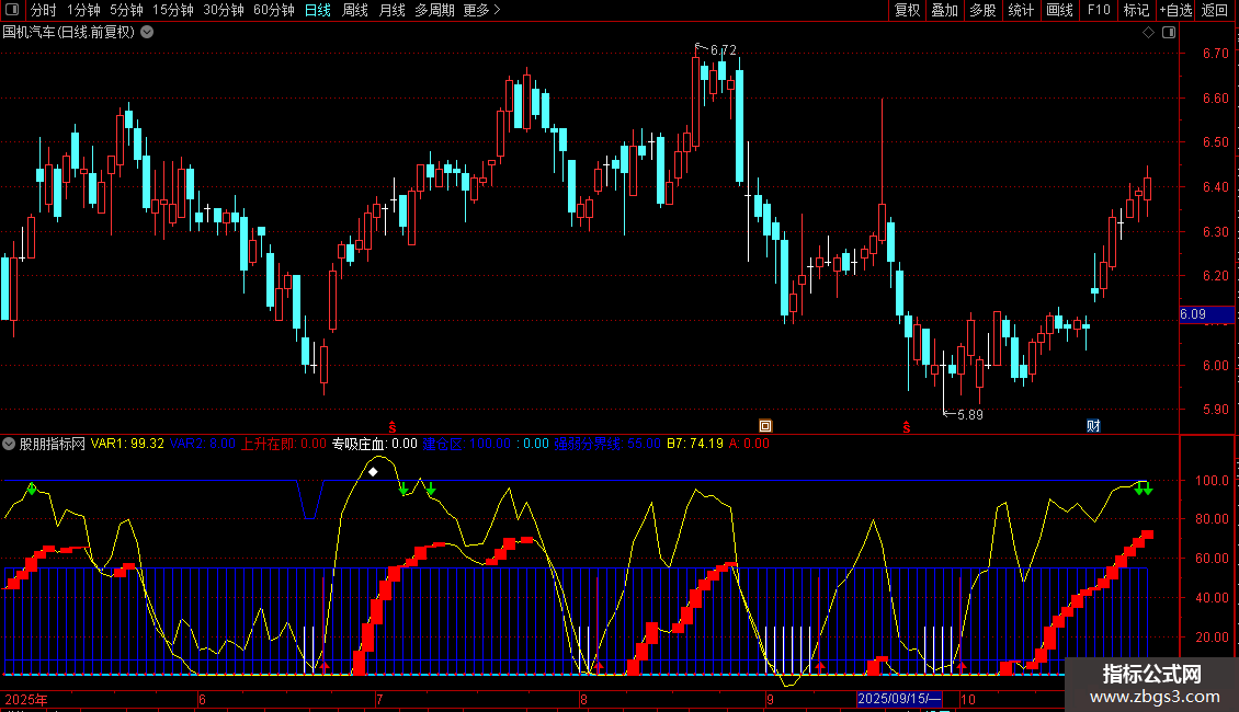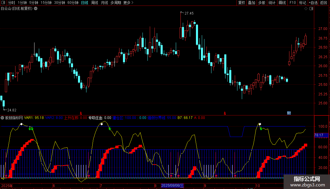 上升在即: IF(CROSS(VAR1,VAR2),50,0),STICK,COLOR0000CC,LINETHICK2;