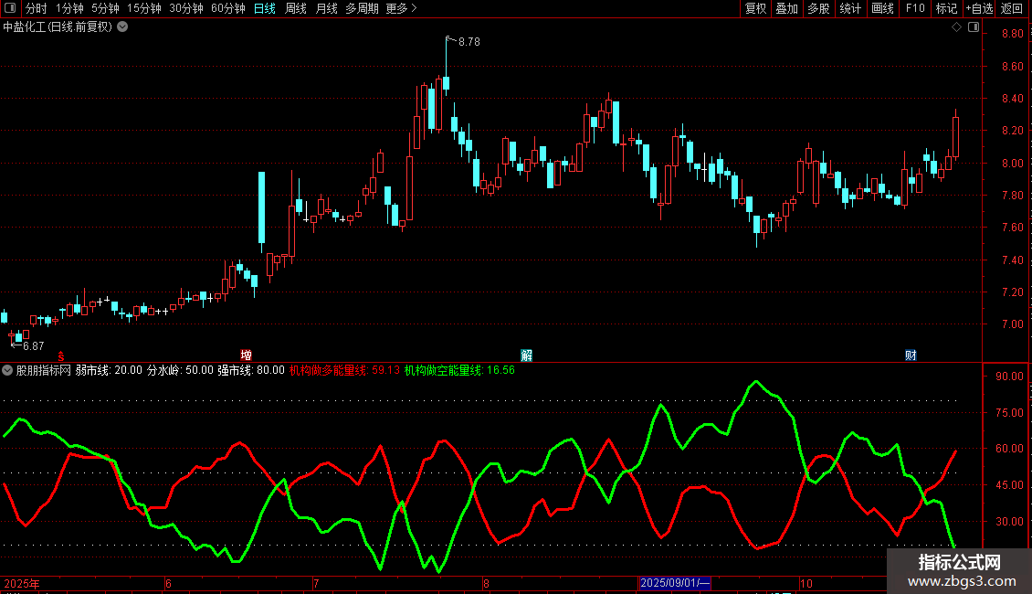 输出机构做多能量线:(收盘价-9日内最低价的最低值)/(9日内最高价的最高值-9日内最低价的最低值)*100的5日[1日权重]移动平均-8,画红色,线宽为3