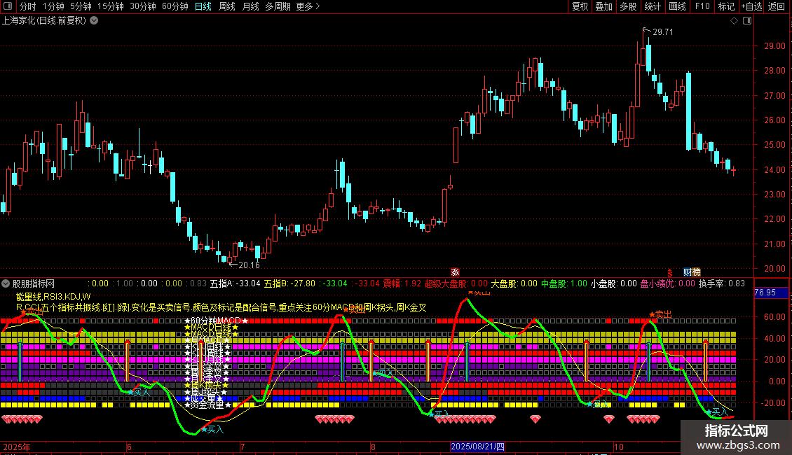 (能量线+RSI+J-威廉WR+CCI)/5的5日加权移动平均,COLOR00FF00,线宽为3