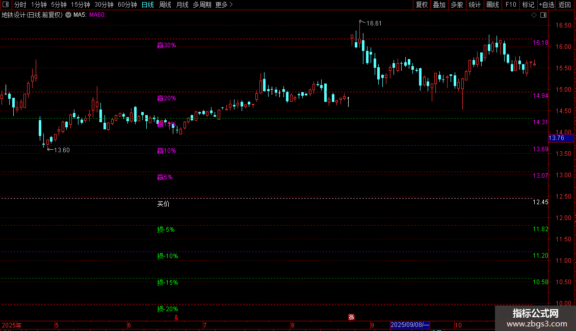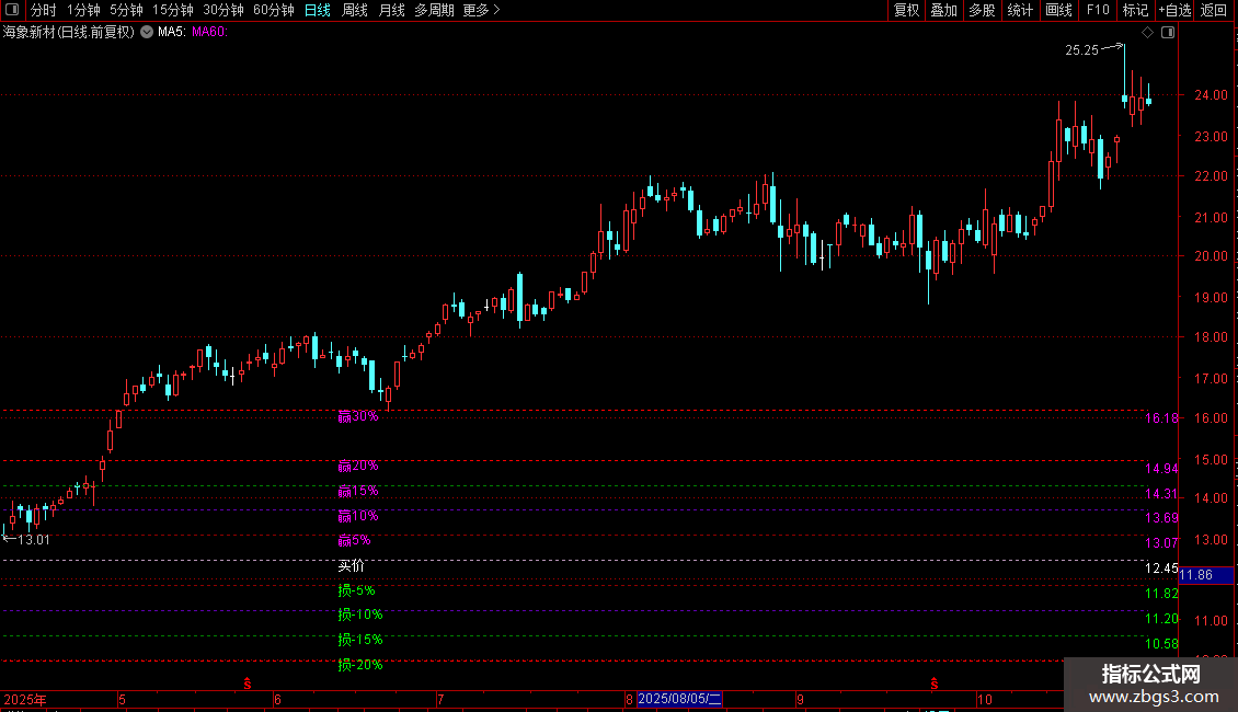 该指标在K线图上绘制多条水平线,直观显示买入价、不同盈利目标位(5%-30%)和止损位(5%-20%),帮助投资者快速定位关键价格区间。