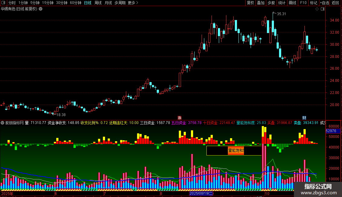 中点:=REFDATE(HHV(V,100)/2,DATE);{量能饱和的变色切换}
