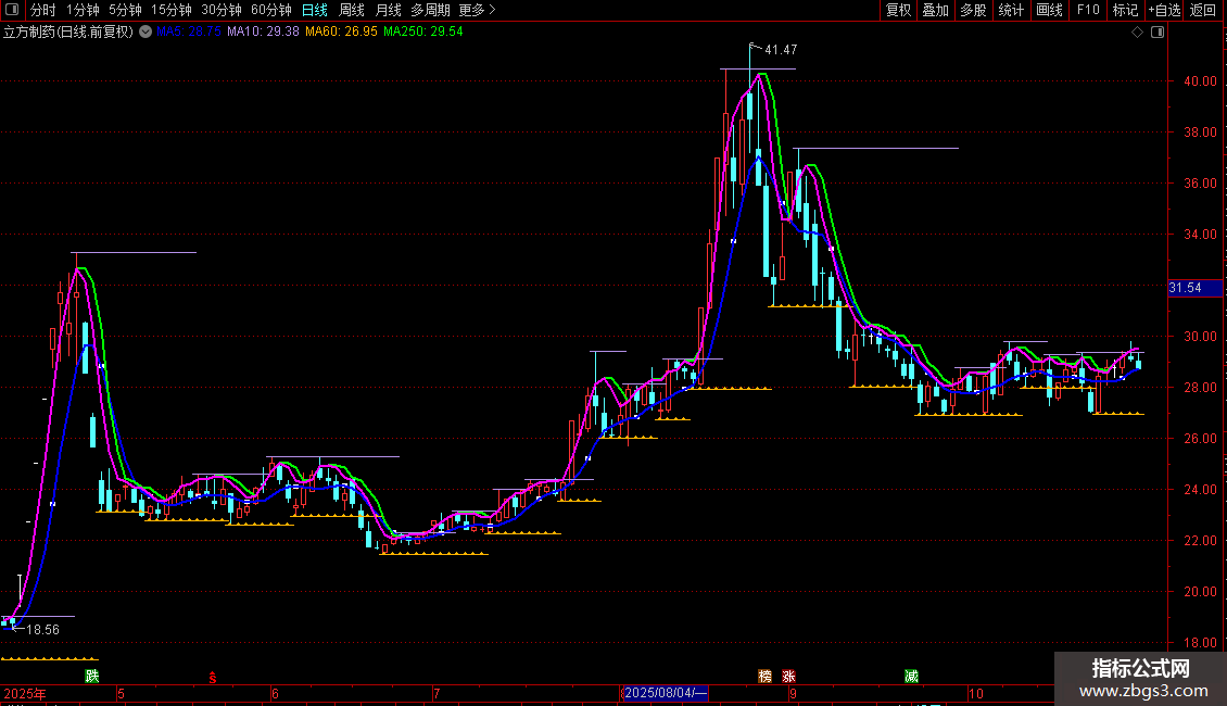 强势单线持股:LLV(MA(HIGH,(3)),1),LINETHICK2,COLORFF00FF;