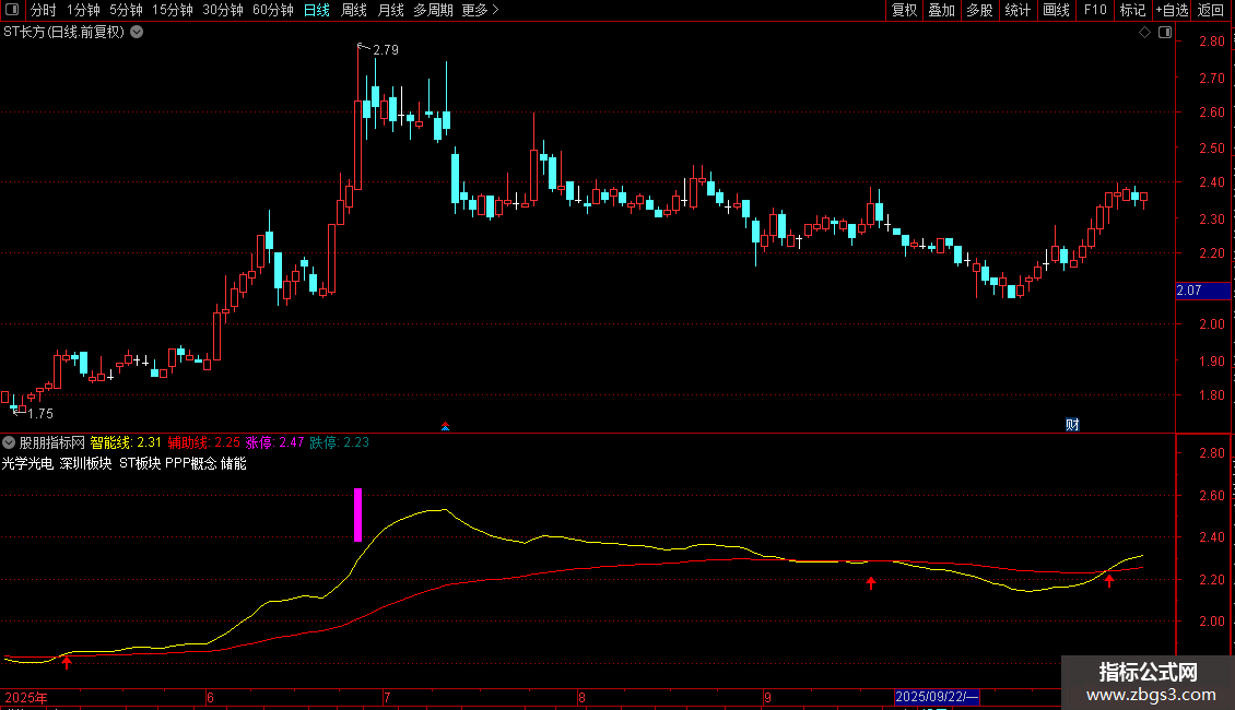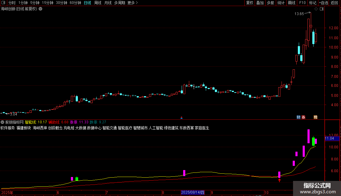 2、买入后股价沿着智能线上走继续攀升,当股价有效跌破智能线时可考虑卖出止盈。