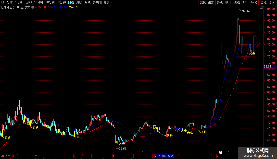 DRAWTEXT(FILTER(买=1,5),LOW-0.05,'↖买进'),COLORYELLOW;