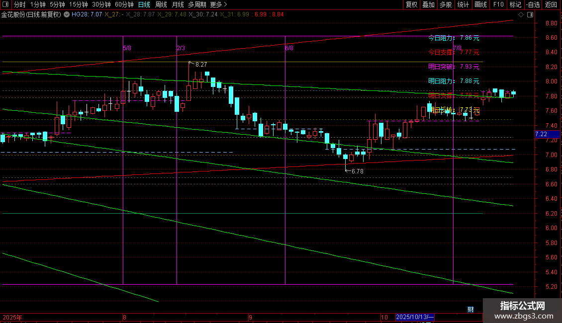 通过加权价格计算动态支撑阻力位,结合历史高低点识别关键突破与反转信号。系统自动标注当前及未来交易日的重要价格区间,并基于斐波那契比例划分波段空间,辅助判断趋势强弱和买卖时机。