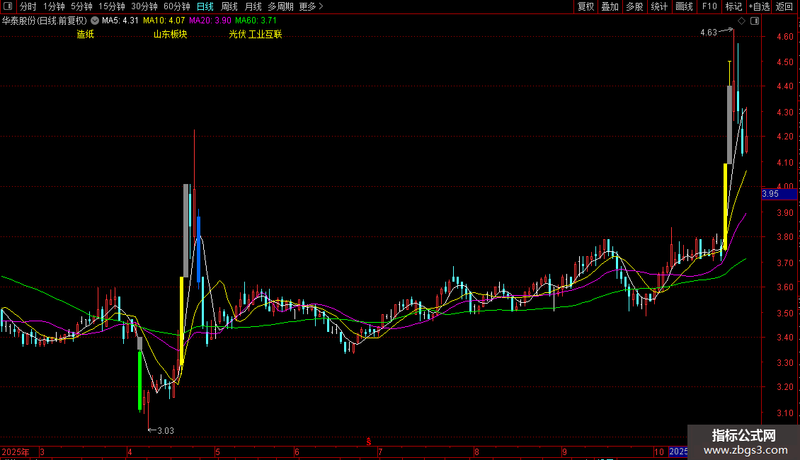 普通K线图不显示涨跌停,所以把涨停设置为黄色K线,跌停设置为绿色K线。一般大于5%的K线对于趋势扭转比较又意义,但是普通主图也是不显示的,所以把>5%的阳线设置成粉色,>5%的阴线设置成蓝色,置于K线上一目了然,非常清晰。