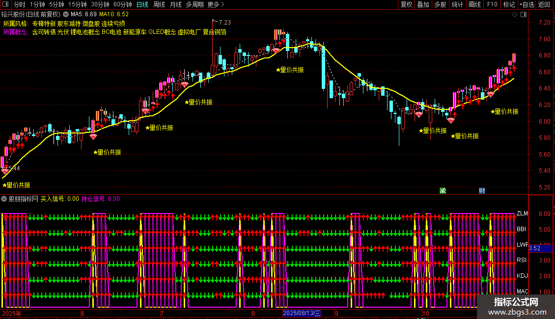 指标通过整合MACD、KDJ、RSI、LWR、BBI和动量指标,实现多指标共振判断买卖点。当所有指标同时发出金叉信号时,产生买入信号;持续满足条件则显示持仓信号。