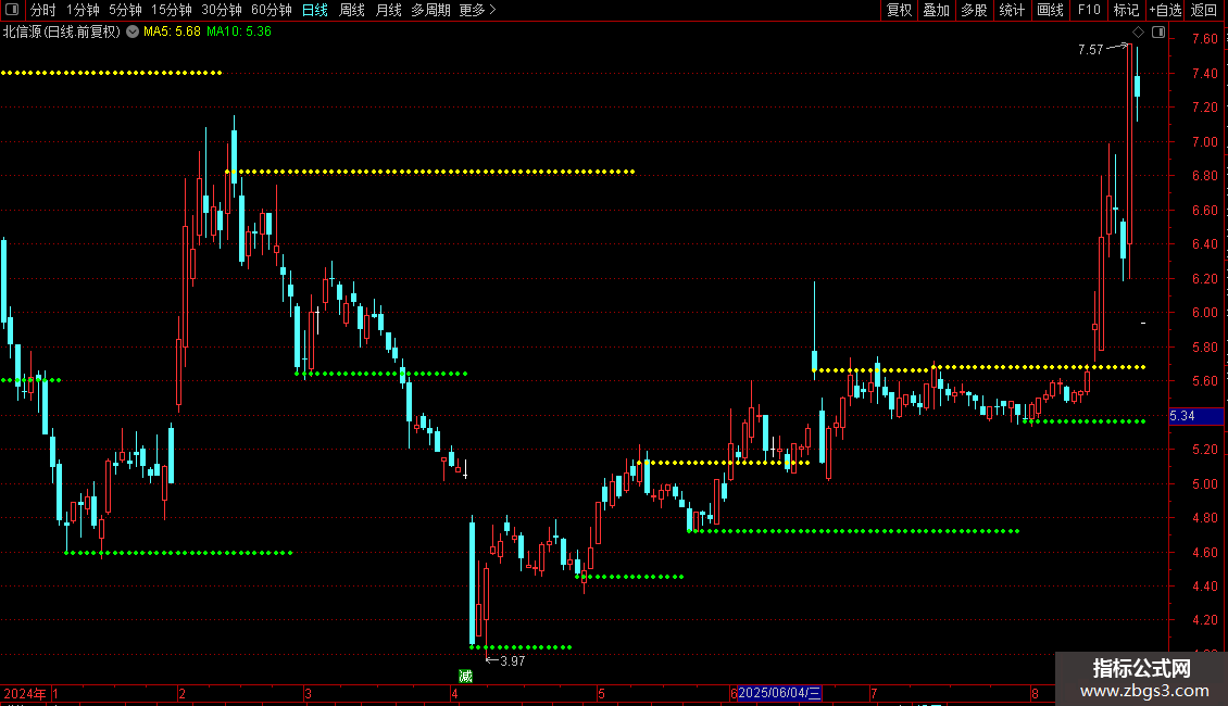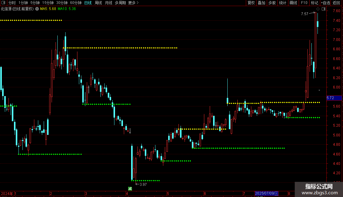 支撑:IF(T2,B,B),COLORGREEN,POINTDOT,LINETHICK4;