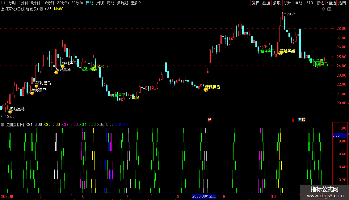 指标通过多组均线交叉、动量强度和超跌反弹信号,识别股票短期强势起涨点。当短期均线上穿中长期均线且成交量放大时提示"黑马买点";在价格超跌区域结合动量反转捕捉"超跌黑马"机会;综合量价、波动率和趋势强度筛选出"大黑马"标的。