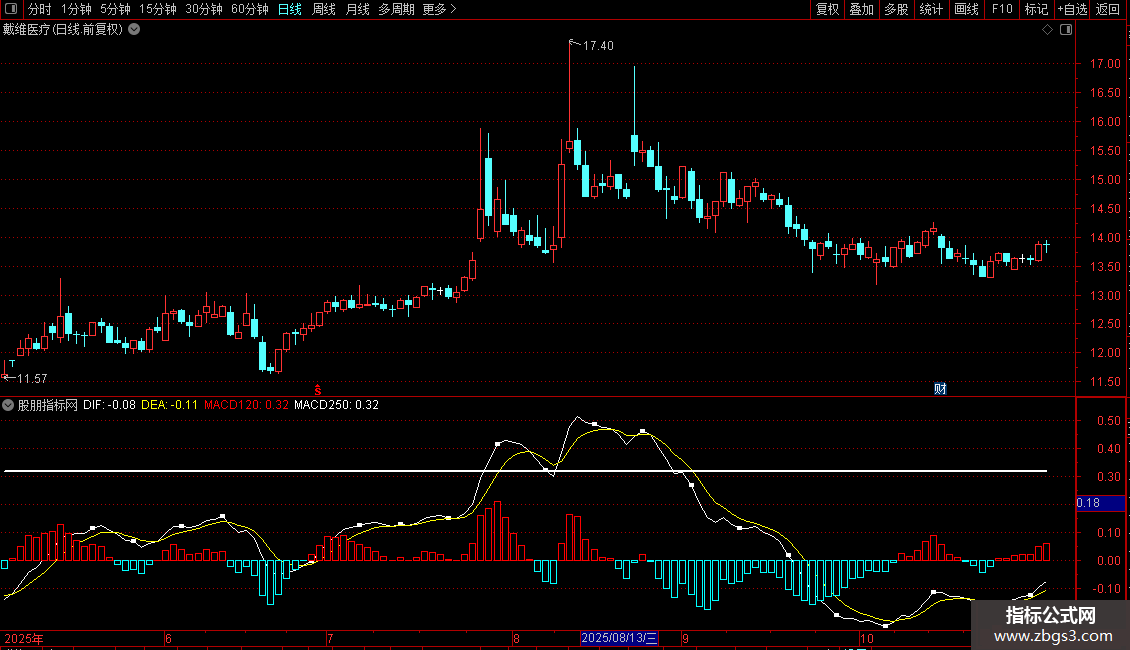DIF:EMA(CLOSE,12)-EMA(CLOSE,25);DEA:EMA(DIF,5);MACD:=(DIF-DEA)*2;STICKLINE(MACD>0,MACD,0,3,1),COLORRED;STICKLINE(MACD<0,MACD,0,3,1),COLORCYAN;MACD120:REF(MACD/2,BARSLAST(MACD=HHV(MACD,120))),COLORRED,LINETHICK2;MACD250:REF(MACD/2,BARSLAST(MACD=HHV(MACD,250))),COLORWHITE,LINETHICK2;XG:=NOT(REF(MACD120,1)=MACD120);STICKLINE(XG,0,MACD,2,0),COLORYELLOW;STICKLINE(MACD>=MACD250,MACD250,MACD,2,0),COLORMAGENTA;大行情:=NOT(REF(MACD120,1)=REF(MACD250,1)) AND MACD120=MACD250;DRAWTEXT(XG,0,'↖金柱'),COLORYELLOW;DRAWTEXT(大行情,0,'↖大牛启动'),COLORYELLOW;