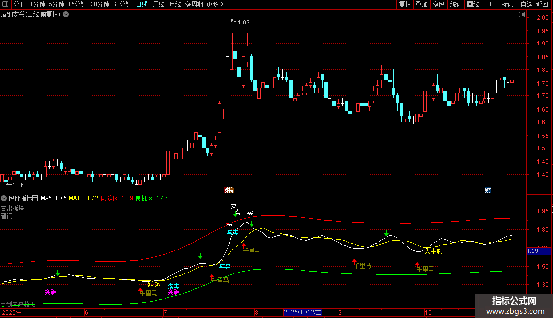 DRAWTEXT((ZIG(3,5)>REF(ZIG(3,5),1)) AND (REF(ZIG(3,5),1)<=REF(ZIG(3,5),2)) AND (REF(ZIG(3,5),2)<=REF(ZIG(3,5),3)),LOW*0.94,'千里马'),COLORBROWN;