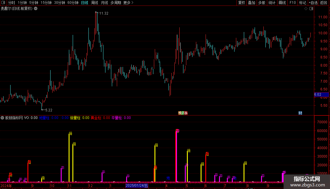 DRAWTEXT(地量柱,VOL+3000,'地'),COLORBLUE;