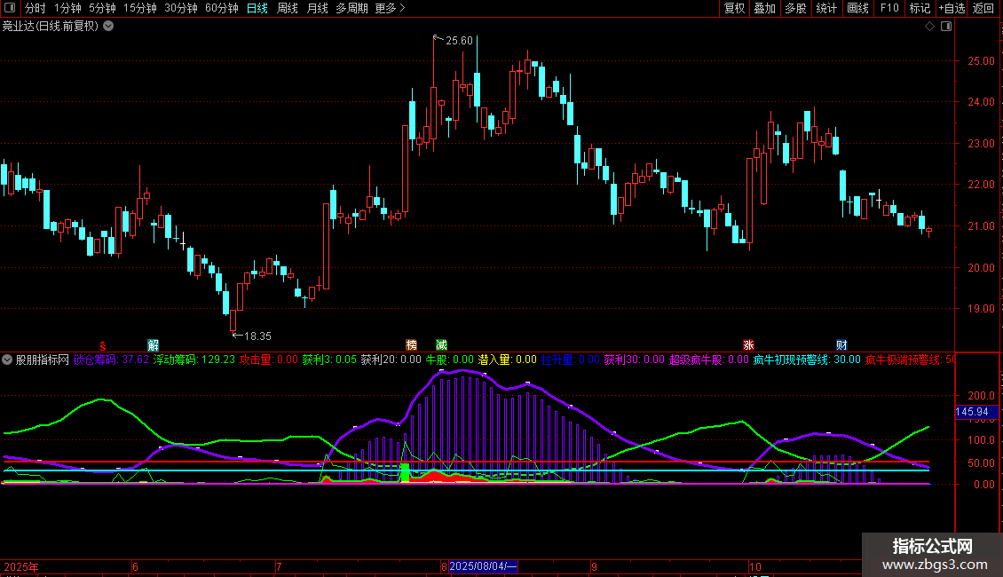 当满足条件获利30>20时,在超级疯牛股和0位置之间画柱状线,宽度为3.5,0不为0则画空心柱.,COLORFF00FF,线宽为3