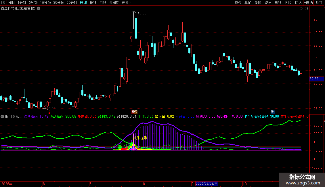 当满足条件超级疯牛股上穿疯牛极端预警线时,在180位置书写文字,COLOR00FFFF