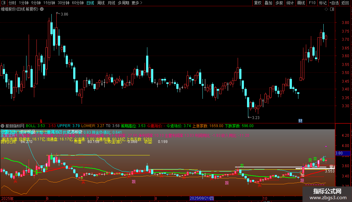 DRAWTEXT(FILTER((CROSS(加仓,0) OR CROSS(CLOSE,CB)) AND 买=1,3),LOW-0.03,'加'),COLORWHITE;