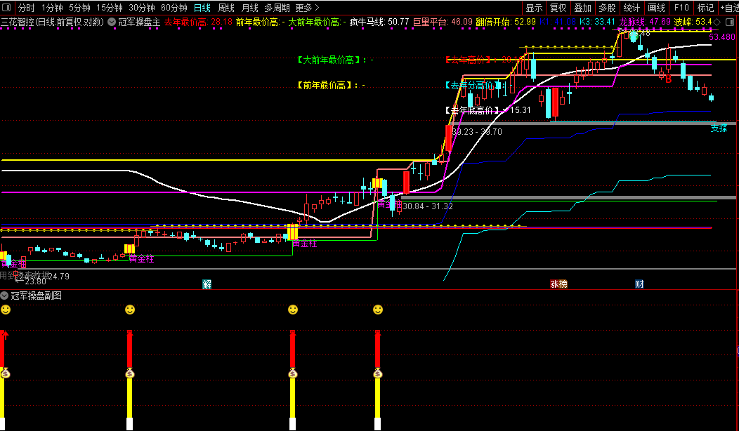 整合了几个主图指标主要是构建了这个冠军操盘主副图和选股。其特点是对年线,两年线等压力线进行了划线,同时对一些主要的k线形成的压力线进行了划线,适合做中线。严格据此操作,会有不错的收益。