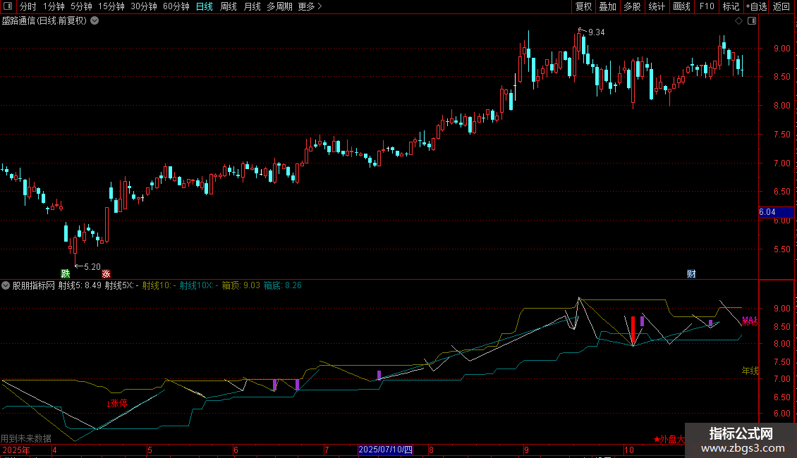 射线10X:DRAWLINE(L=LLV(L,10),L,H=HHV(H,10),L,0),COLORLICYAN;