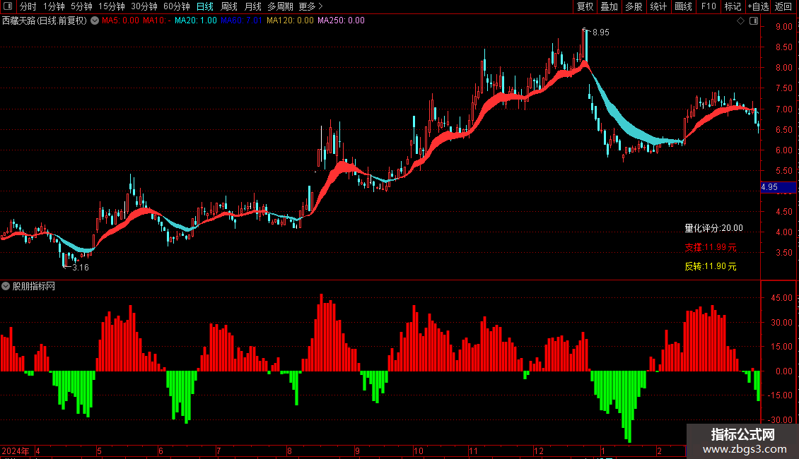 3、红色彩带为主力操盘线,彩带扩大表明多头趋势增强,应持股;彩带缩小预示多头趋势减弱,警惕多头终结。