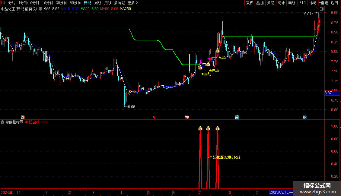 操作策略:当“牛妖启动”信号出现且当日收阳线时,视为潜在买入机会。 该信号需结合价格突破长期趋势线、特定K线组合(如前期大阳线+当前小实体阳线)共同确认。