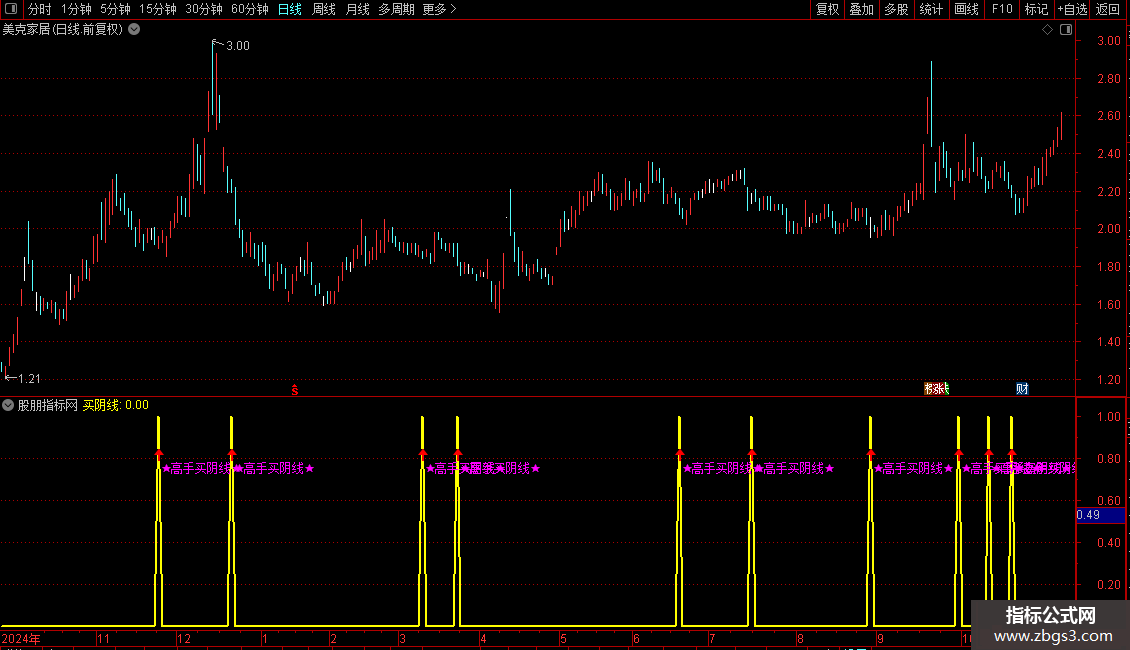 指标通过短期和长期均线的关系、价格在近期波动区间的位置,以及成交量均价的偏离度来识别买入机会。当短期均线下穿长期均线后,结合股价处于相对低位且收盘价低于均价时,在次日出现阴线且创前日新低时发出买入信号。