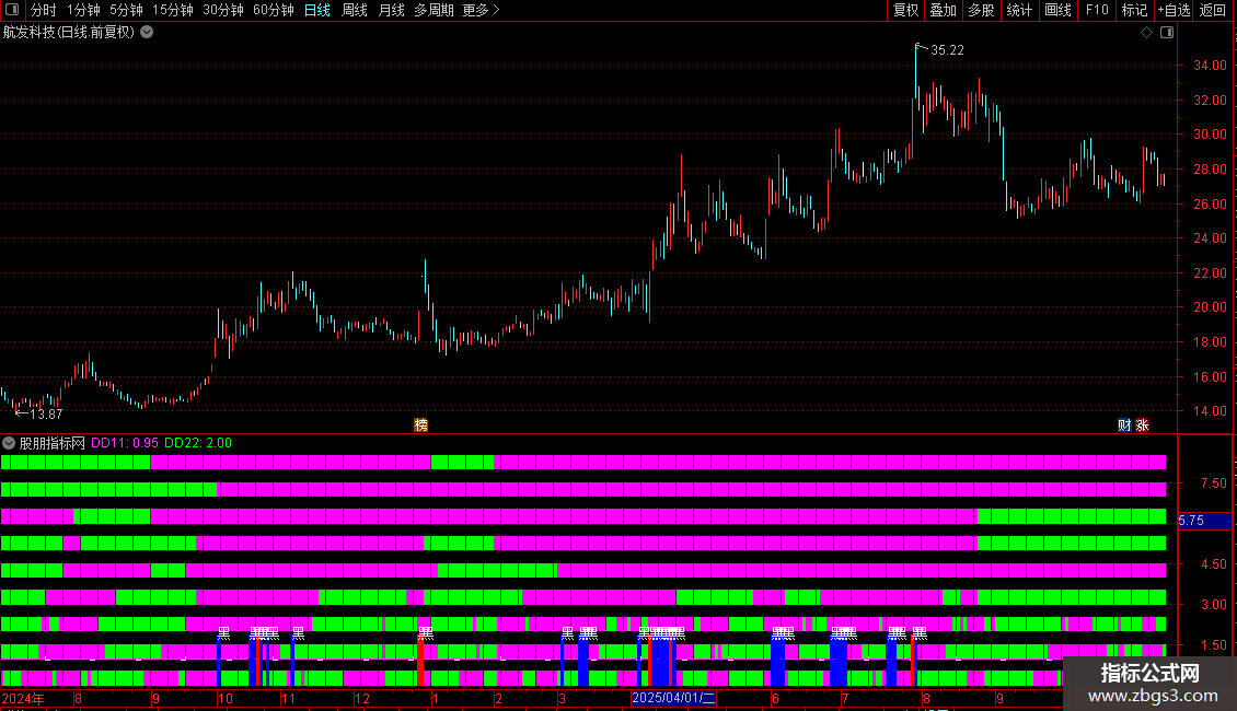 当满足条件日DIF>日DEA时,在1和1.5位置之间画柱状线,宽度为4,0不为0则画空心柱.,画洋红色,线宽为2