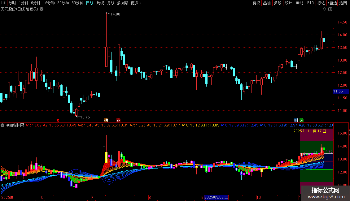 A6:EMA((EMA(C,11)+EMA(C,13)+EMA( C,15))/3,3),COLOR1060FF;