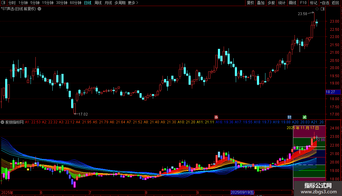 A8:EMA((EMA(C,15)+EMA(C,17)+EMA( C,19))/3,3),COLOR1080FF;