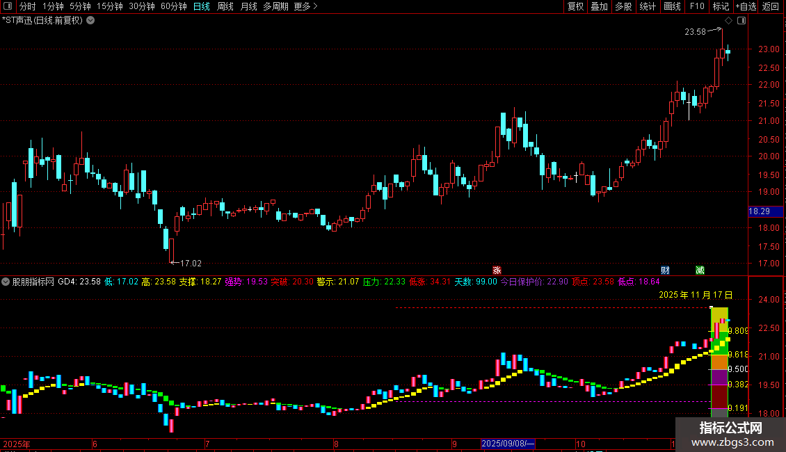 DRAWTEXT(CURRBARSCOUNT=1,警示,'0.618'),COLOR00FFFF;