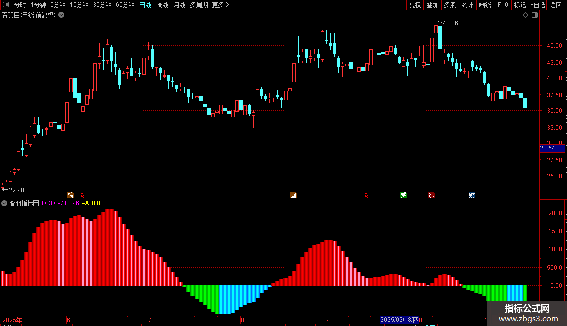 当满足条件VAR2>50ANDCOST(60)0时,在主力和0位置之间画柱状线,宽度为3,0不为0则画空心柱.,COLOR0000BB