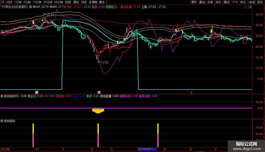 强势阶段:IF(EMA(CLOSE,2)>HHV(EMA(CLOSE,5),26) AND A5>0*X_4,持股线,0),COLORMAGENTA,LINETHICK3;