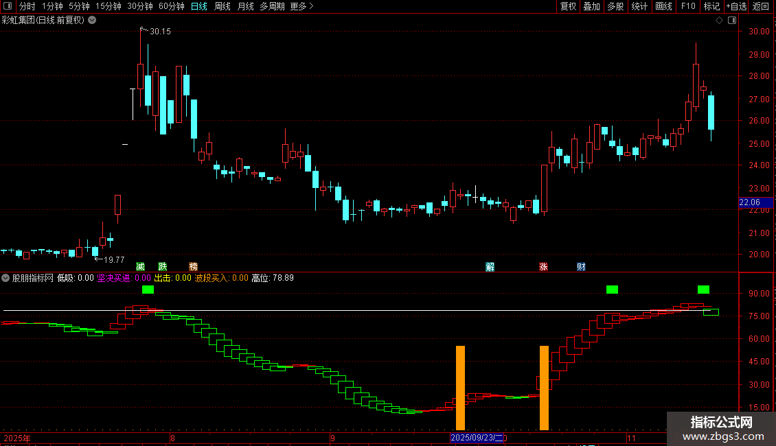 波段买入:IF(CROSS(D1,K1),55,0),COLOR0099FF,POINTDOT;