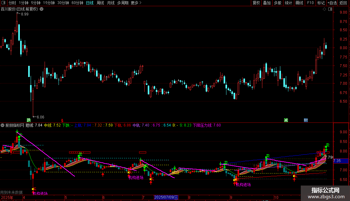 DRAWTEXT(VAR11 AND COUNT(VAR11,30)=1,LOW*0.95,'机构进场'),LINETHICK1,COLORFF00FF;