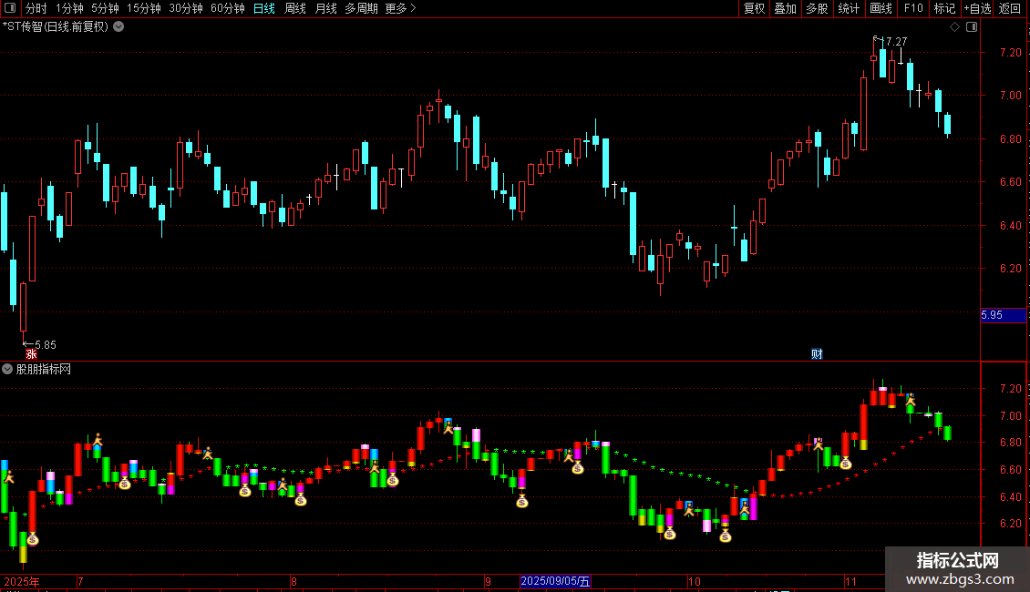 DRAWTEXT((CLOSE>MMM),MMM,'*'),COLOR0000FF,LINETHICK5;
