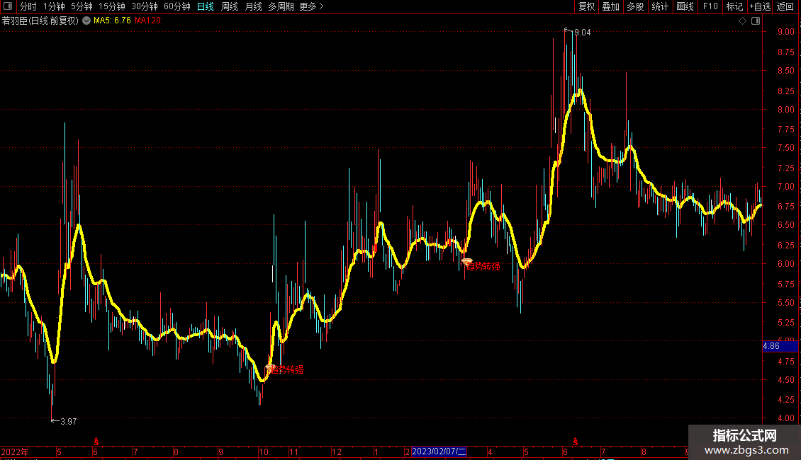 趋势线:(MA(C,3)+MA(C,6)+MA(C,12)+MA(C,24))/4,COLORYELLOW,LINETHICK4;