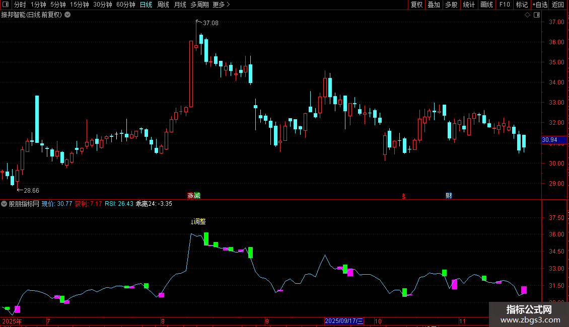 DRAWTEXT(CROSS(RSI,80),H*1.03,'↓调整'),COLORYELLOW;