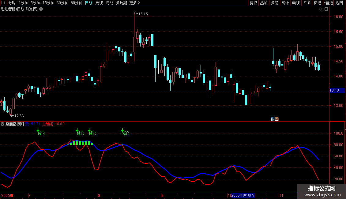 DRAWTEXT(CROSS(80,决策线),100,'减仓'),COLOR00FF00;