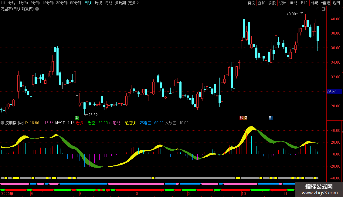核心逻辑为:当J线上穿D线(粉紫线)且MACD红柱放大时,触发中短线看多信号;反之,绿柱扩大伴成交量萎缩则提示看空。