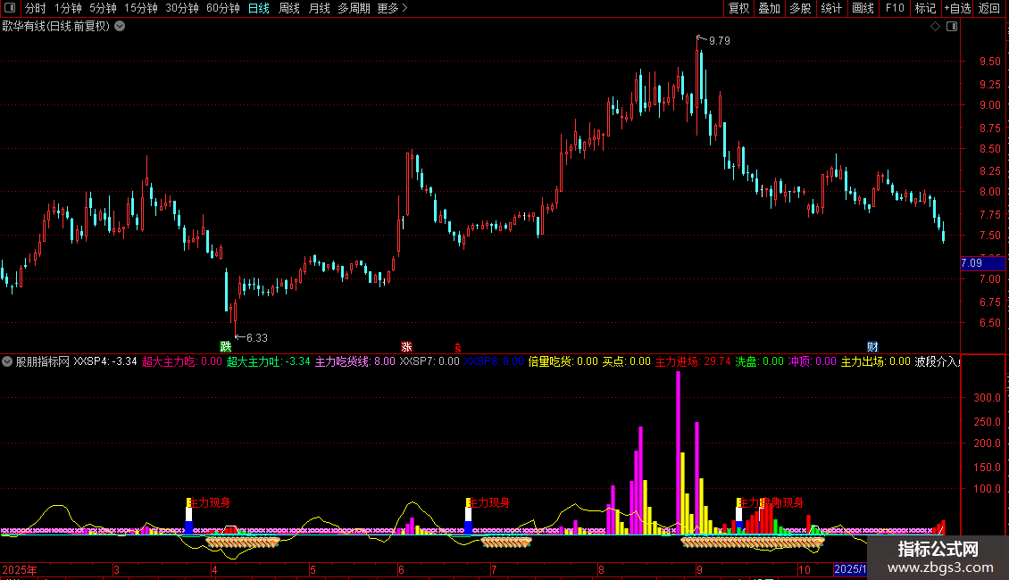 指标通过多维度计算识别主力资金动向。主要功能是监控主力买入、洗盘和出场信号:当出现"超大主力吃"突破、价格创新高伴随放量时,视为买入机会;当指标显示主力持续流出或价格高位滞涨时,提示风险。操作策略是跟随主力资金流向,在主力进场时买入,主力出场时卖出。