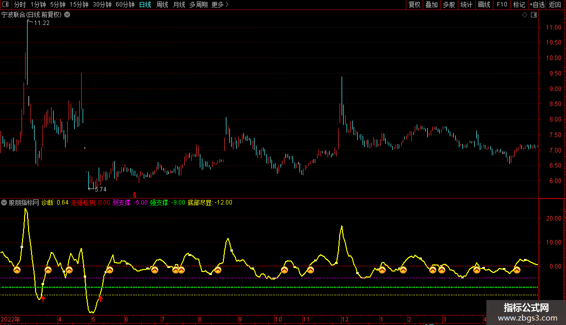 指标通过计算股价与均线的偏离程度来判断股票强弱状态。当指标线上穿底部区域时显示买入信号,上穿零轴时确认走强。操作策略是在底部信号出现时关注,走强信号确认后介入。