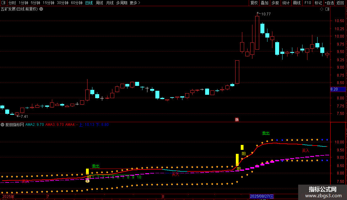 AMA2:EMA(DMA(CLOSE,CQ2),2),COLORLIBLUE,LINETHICK2;