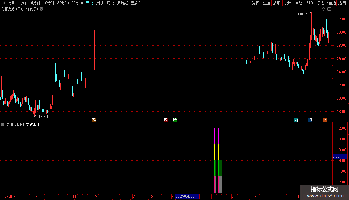 当满足条件如果突破盘整,返回-120,否则返回0时,在+3和0位置之间画柱状线,宽度为3,0不为0则画空心柱.,COLORFF00FF