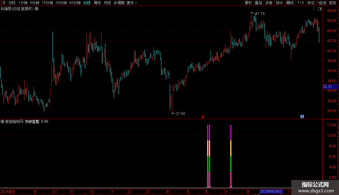 DRAWTEXT(突破盘整,1.5,''),COLORRED;