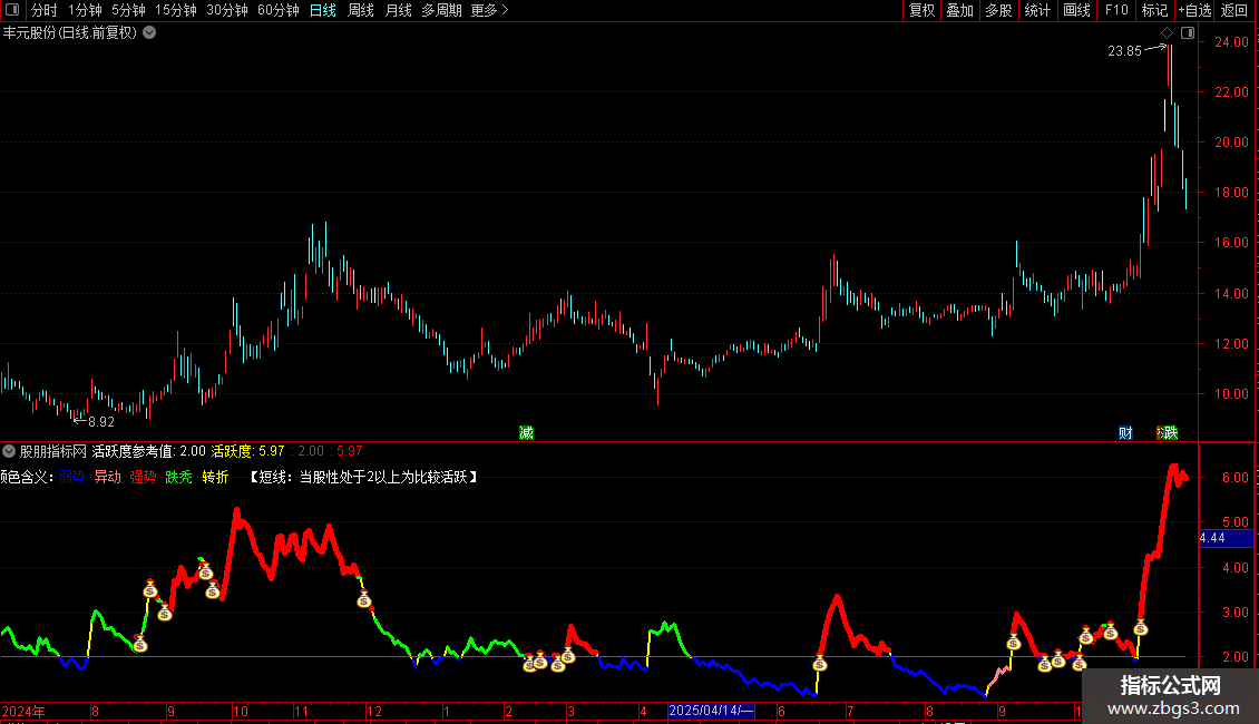 IF(VAR2>0,活跃度,DRAWNULL),COLORLIRED,LINETHICK3;