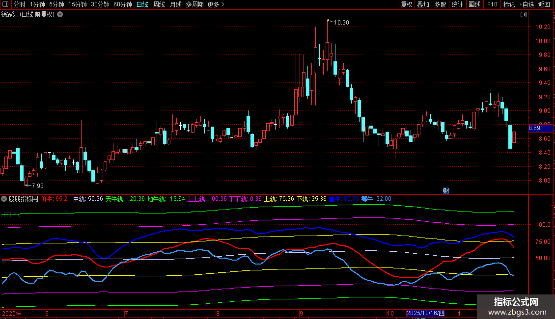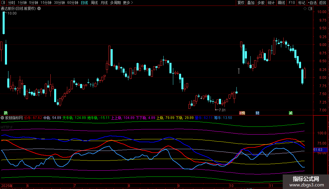 1. 彩线寻牛将量牛和价牛分别用彩色线表示,包含变化上下轨,彩线结合运用交叉形成彩线寻牛指标;