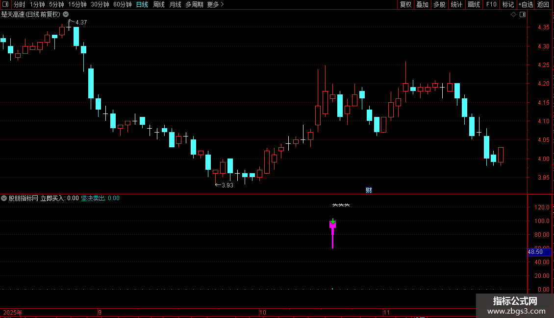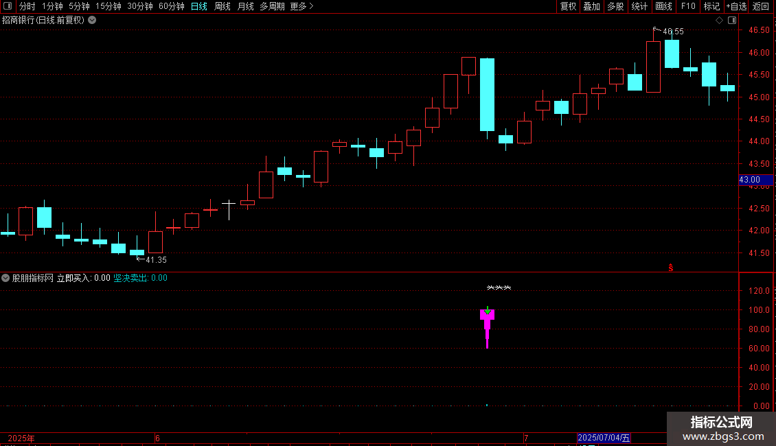 指标通过识别短期价格低点共振与强势突破信号产生买入提示,同时利用动量超买指标捕捉卖出时机。操作策略为:当出现短期底部确认且价格强势上攻时立即买入;当动能指标从高位回落时坚决卖出。
