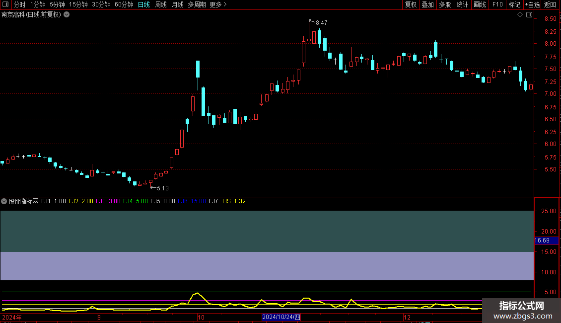 当满足条件收盘价>0时,在FJ6和FJ7位置之间画柱状线,宽度为5,0不为0则画空心柱.,COLOR4F4F2F