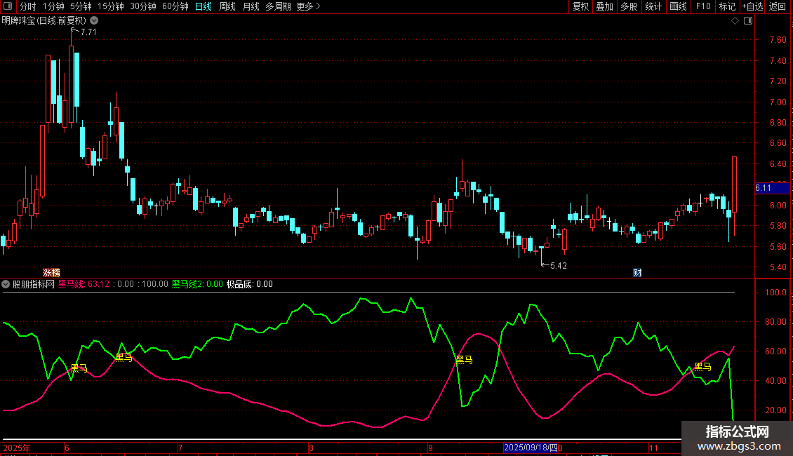 黑马线:EMA(VAR11,5), LINETHICK2,COLOR6600FF;