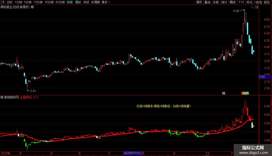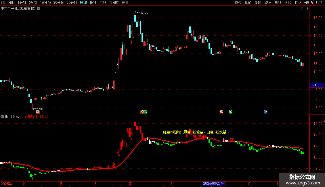DRAWTEXT(C AND CURRBARSCOUNT=80 ,AAA, '红色K线做多,绿色K线做空,白色K线观望。 '),COLORYELLOW;