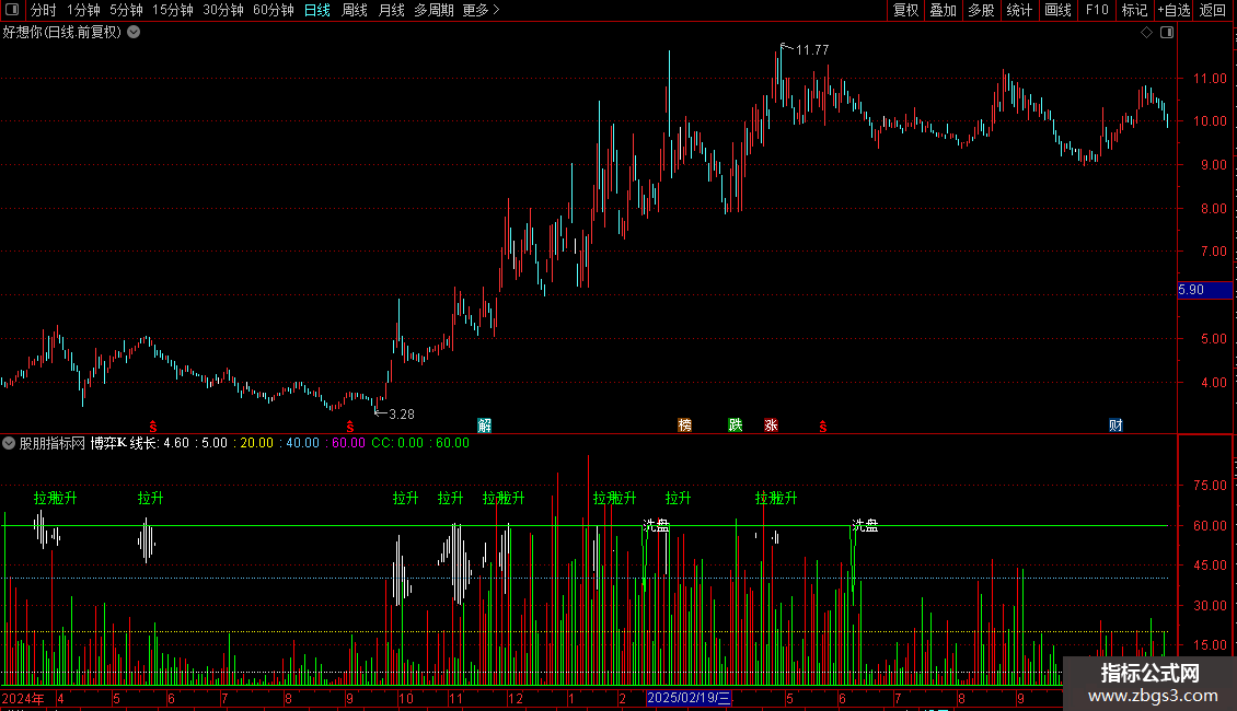 STICKLINE(收<=REF(收,1),0,博弈K线长,0,0),COLOR00FF00;